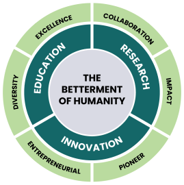 We work with determination to prepare graduates who rise to the challenge of today’s complex problems across industries, research fields, and economic sectors. Through our cumulative efforts, we contribute to national development and global progress by innovating with intent and impact.